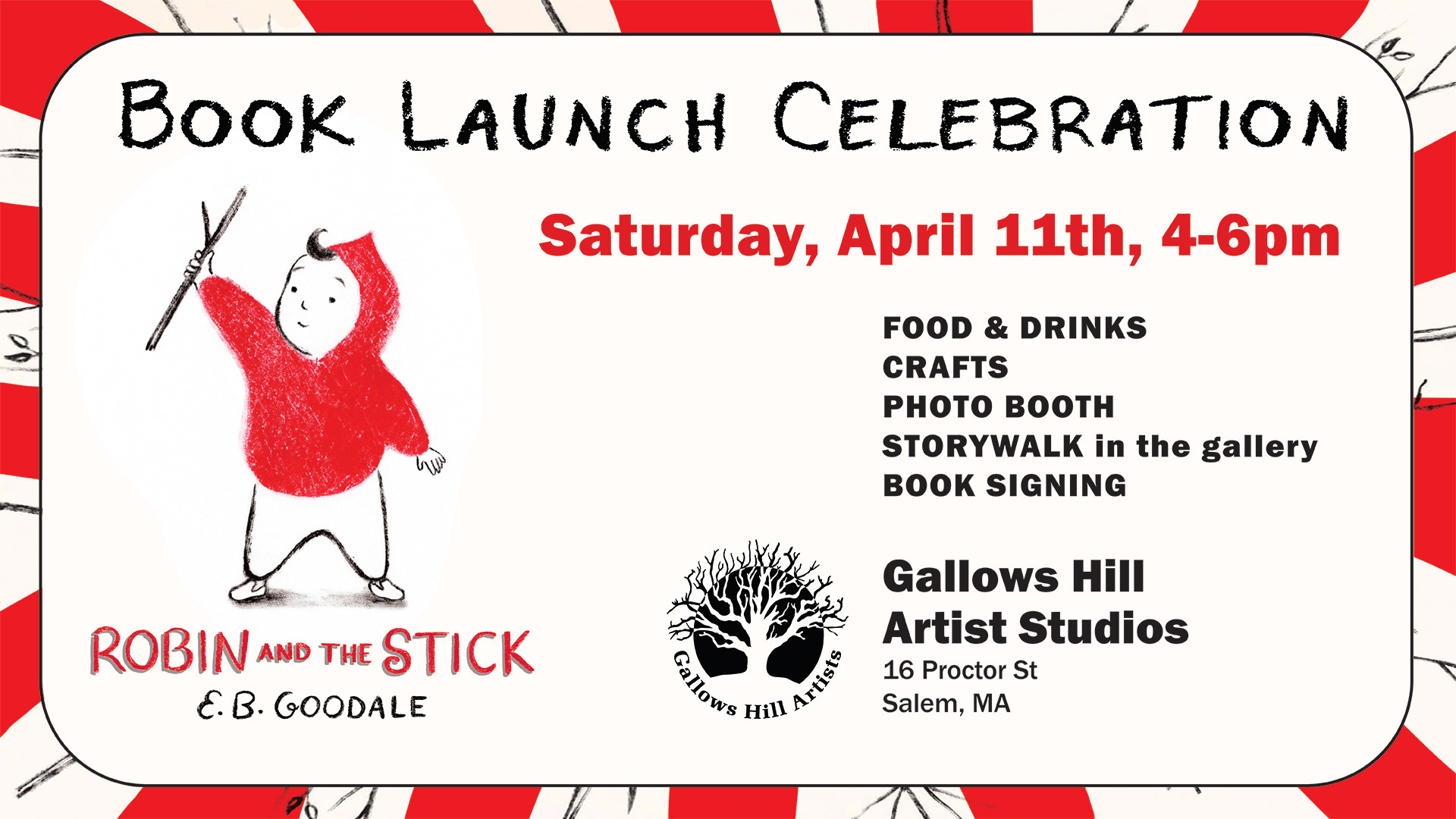 E. B. Goodale hosts the public in her studio to celebrate the launch of her new picture book character, Robin. Refreshments, activities, peek into the artist’s process, book for sale in partnership with The Bookshop at Beverly Farms.
